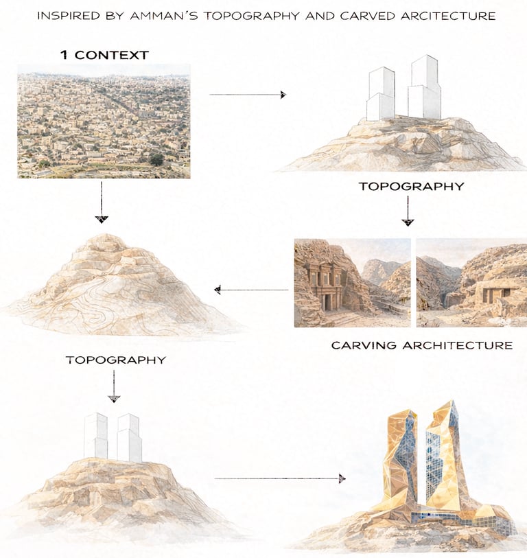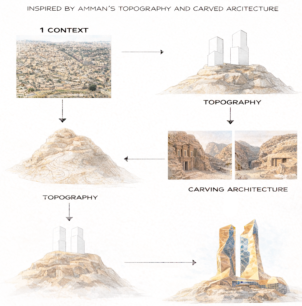 The twin towers reinterpret Amman’s mountainous identity through a bold, sculpted geometry that feels carved rather than constructed, echoing the city's tradition of shaping architecture directly from the terrain.