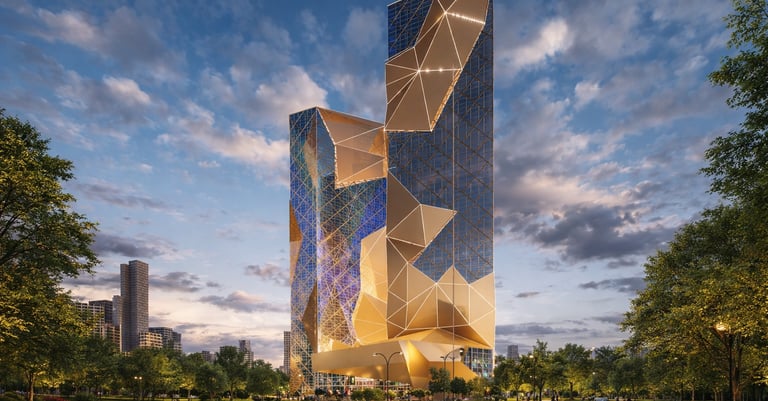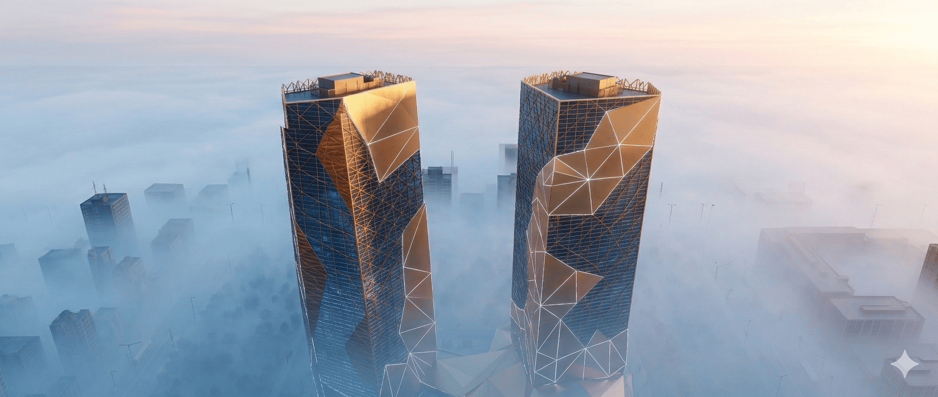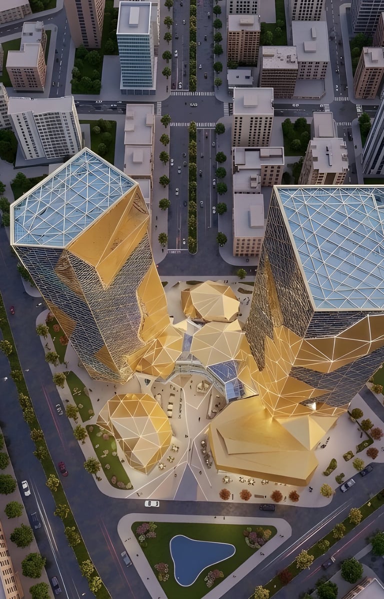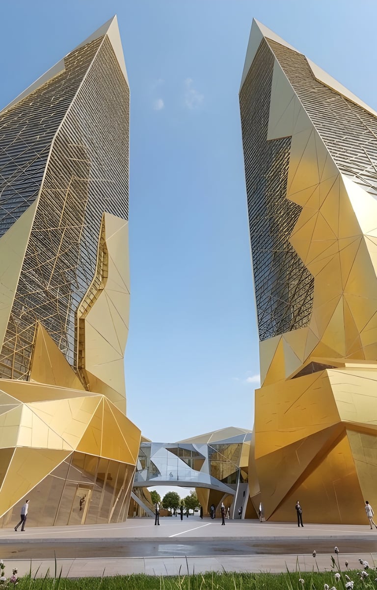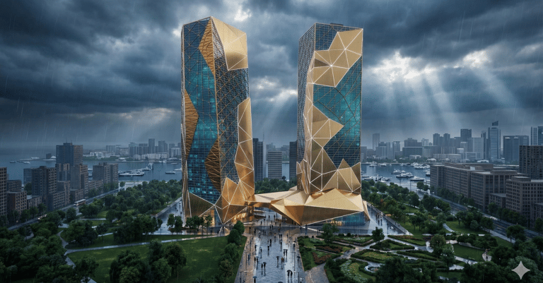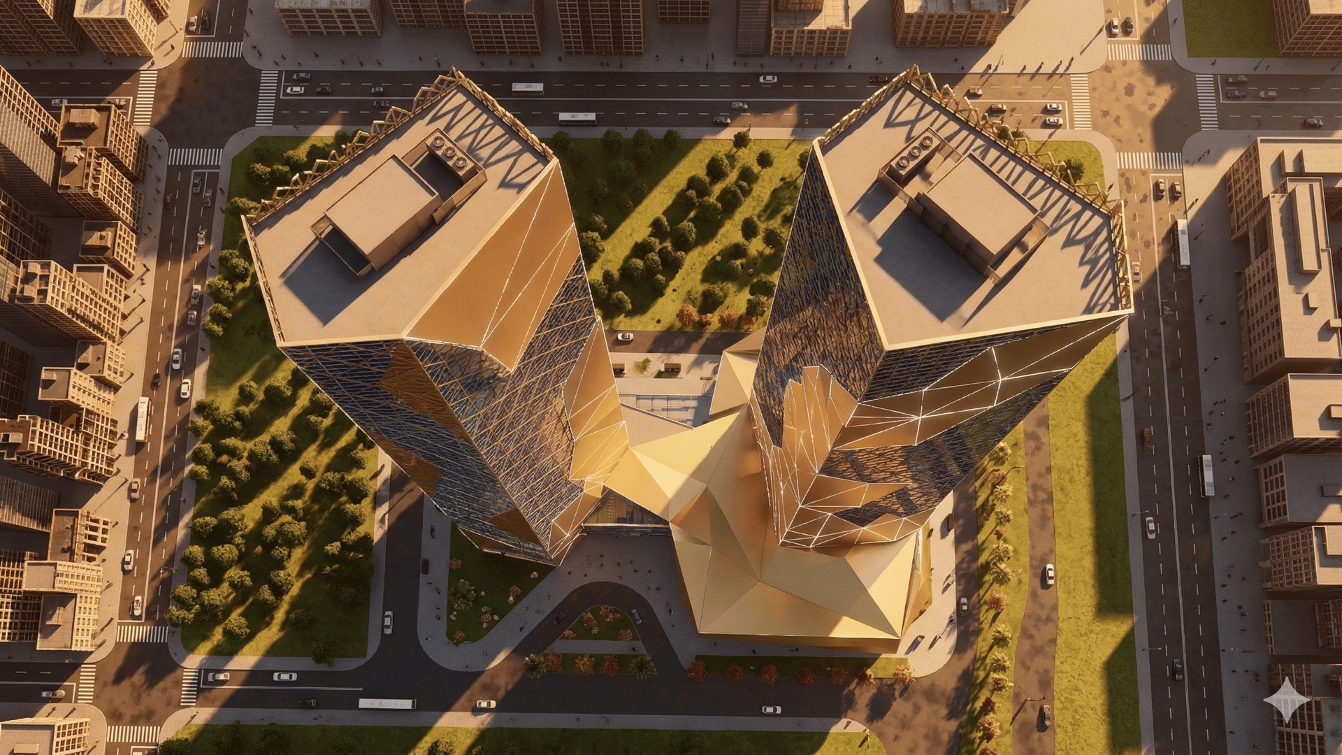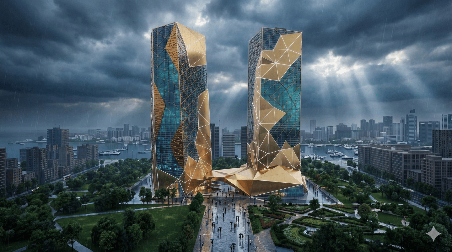 The towers’ angular surfaces are not just aesthetic; they respond to orientation and climate, enabling passive environmental performance through strategic solar protection and ventilation. As a result, the towers become: